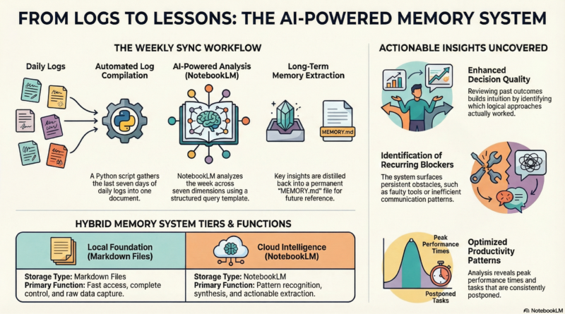 Memory is the foundation of productivity. Without a reliable system to capture, organize, and learn from your experiences, you’re constantly reinventing the wheel. Today, I want to share how I built an automated memory backup system using NotebookLM that transforms raw daily logs into actionable weekly insights.
